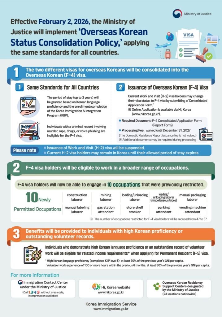 Виза H-2 выдается корейцам, проживающим за границей, которые намерены работать в определённых сферах в Корее.